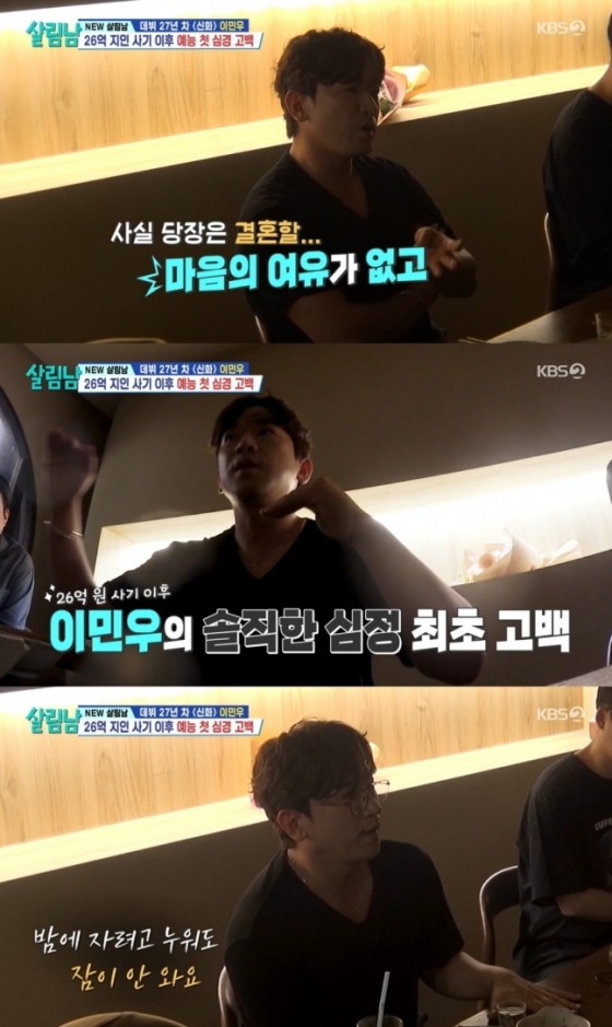 이민우는 지난 11일 KBS 2TV '살림하는 남자들2'에서 A 씨의 사기 행각을 다시 한 번 언급했다. 그는 A 씨에게 전 재산 26억 원을 빼았겼던 과거를 회상, "그런 일이 있고 사실 당장 결혼할 마음의 여유가 없다. 나쁜 사람은 감옥에 보냈고 인간 관계도 다 끊어 버렸다. 가스라이팅을 당해 힘들게 지낼 때는 밤에 자려고 누워도 잠이 안 왔다. 수면제를 먹고 잔다. 그때 엄청나게 울었다. 스스로를 해하기도 하고 '쓰레기 같은 XX'라면서 힘들었다"라고 토로했다.