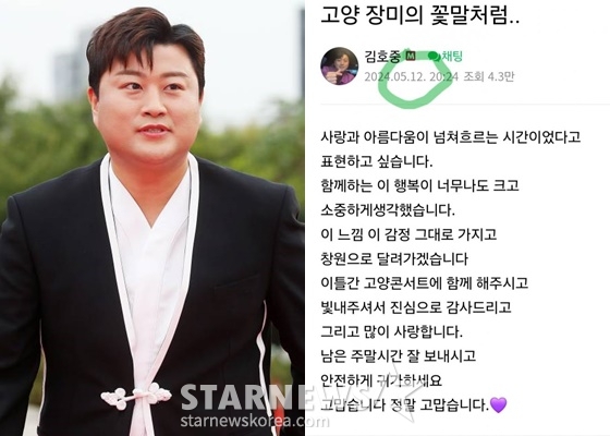 이와 함께 공개된 캡처 사진에 따르면 김호중은 12일 오후 8시 24분 팬카페에 '고양 장미의 꽃말처럼"이라는 제목의 글을 썼다. 11일과 12일 경기 고양종합운동장체육관에서 '트바로티 클래식 아레나 투어 2024 고양' 공연을 마치며 남긴 것.