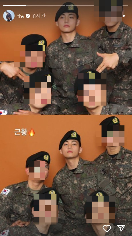 현재 강원도 춘천 육군 2군단에서 사령부 직할 군사경찰단 특임대로 복무 중인 뷔는 19일 자신의 인스타그램 스토리에 "근황"이라는 짧은 글과 함께 여러 장의 사진을 게재했다.