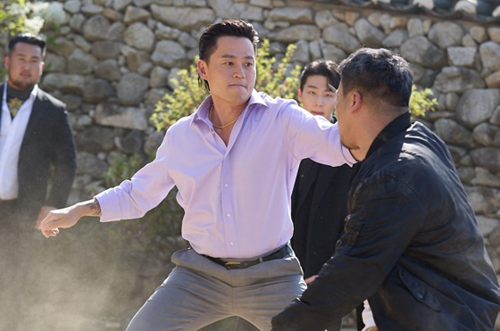 이서진은 압도적 눈빛과 꼿꼿한 자세, 올백으로 넘긴 머리와 이마에 드러난 상처, 풀어헤친 셔츠 단추와 근육질 팔을 둘러싼 문신 등으로 조폭 이인자 김득팔의 날카로운 기세를 엿보게 했다.