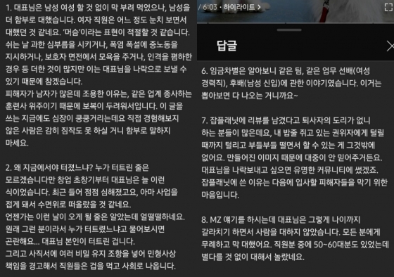 이외에도 A 씨는 보듬컴퍼니의 임금 차별, 영업 이익, 갑질 등을 폭로하면서 "힘없고 돈 없이 미래에 대한 걱정에 하고 싶은 말도 삼키며 사는 직원들은 이것보다 더 힘들었다. 사과만 하시면 다들 넘어갈 거다. 그래도 다같이 회사를 위해서 노력했던 시간이 있으니까. 대표님 가정이 무너지는 것도 원하지 않는다. 어려운 거 아니지 않나. 사과하세요"라고 털어놨다.