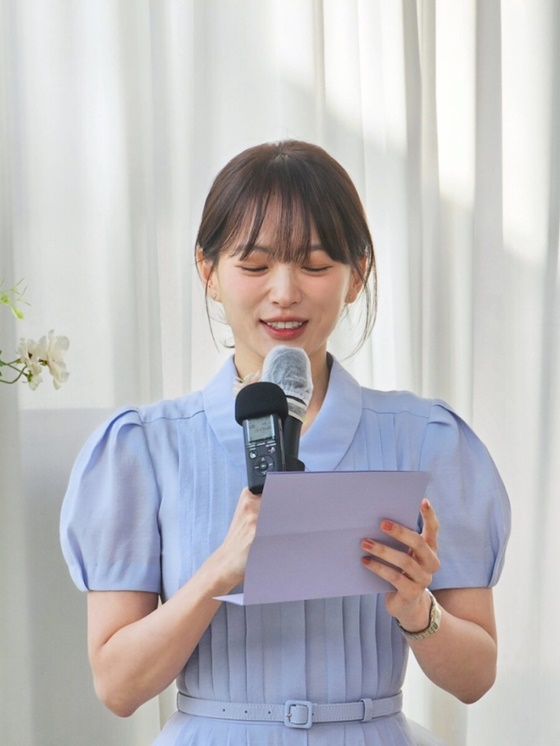 사진 속 천우희는 청순하게 하늘색 원피스를 입은 모습으로, 해맑은 미소를 지으며 축사를 낭독하고 있다.