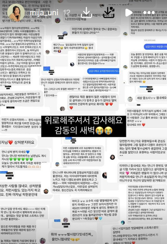 미자는 이를 SNS에 인증하며 "위로해 주셔서 감사하다. 감동의 새벽"이라고 화답했다.