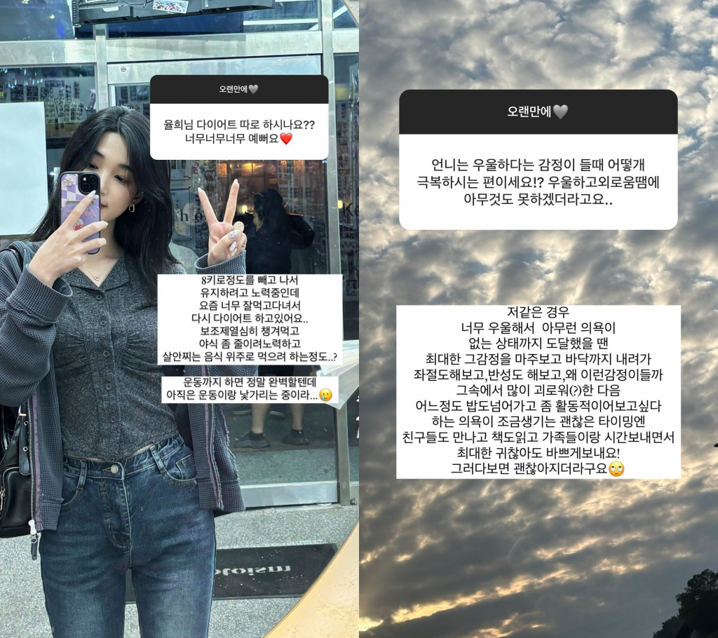 그러면서 다이어트 비법에 대해 묻는 팬에게는 "8kg 정도 빼고 나서 유지하려고 노력 중인데 요즘 너무 잘 먹고 다녀서 다시 다이어트 하고 있다"며 "보조제 열심히 챙겨 먹고 야식 좀 줄이려고 노력한다. 살 안 찌는 음식 위주로 먹으려고 하는 정도"라고 밝혔다.