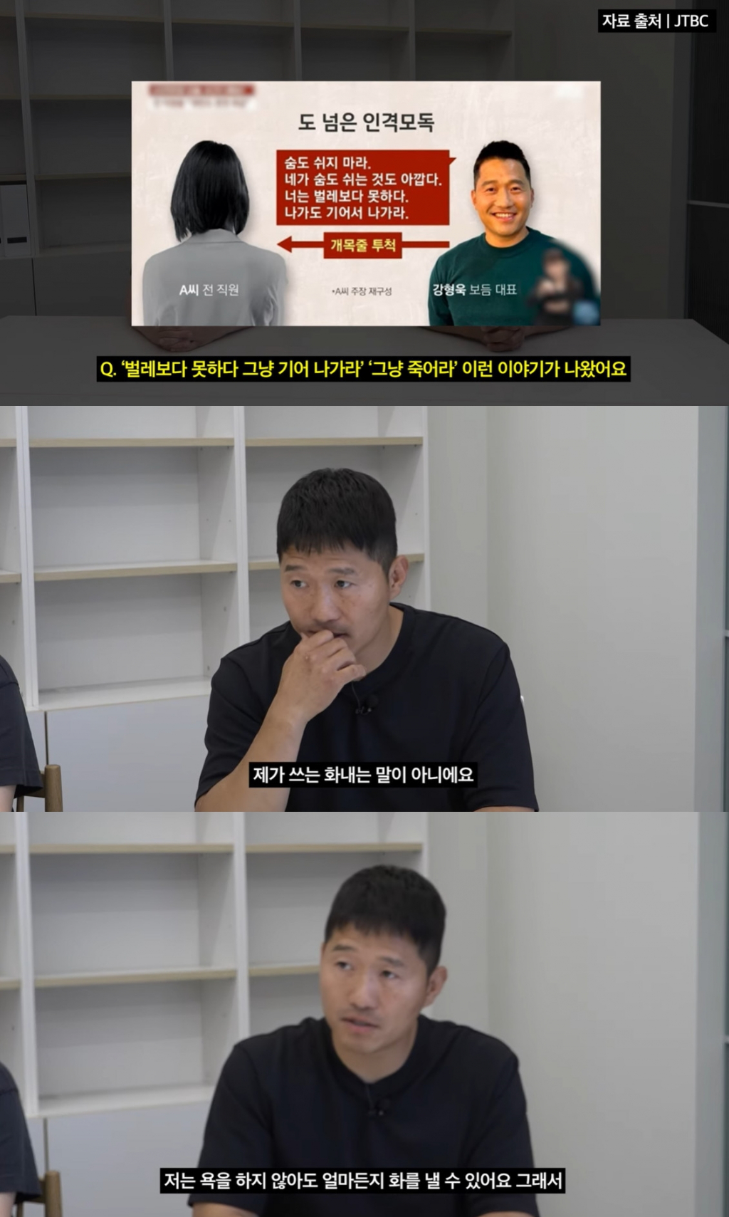 또한 "숨도 쉬지 마라", "벌레보다 못하다", "나가도 기어서 나가라" 등 폭언 논란과 관련해 "내가 쓰는 화가 아니다. 내가 쓰는 말투 아니고 그런 말 안 쓴다. 벌레라는 말, 기어라는 말도 안 한다. 난 욕을 하지 않아도 얼마든지 화를 낼 수 있다. 그런 말은 내가 쓰는 말이 아니다"라고 부인했다.
