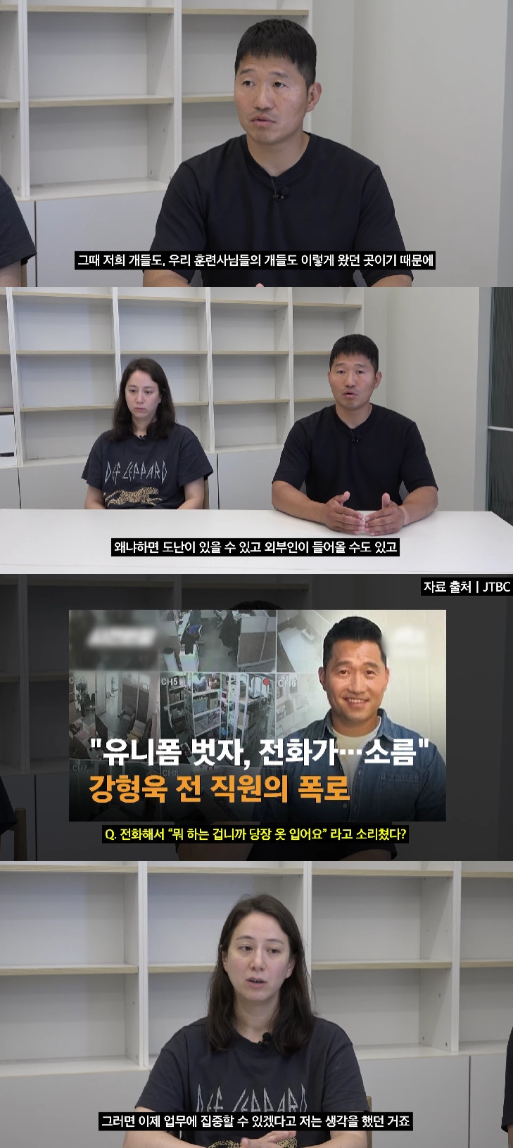 강형욱은 가장 먼저 직원들을 CCTV로 감시했다는 논란에 대해 "감시 용도가 아니다. 사람들이 있는 곳이고, 용품을 갖고 있는 곳이고, 언제든 누구든 들어와서 있을 수 있다. 개들도 우리 훈련사님들의 개들도 있는 곳이니까 CCTV가 꼭 있어야 했다"며 "CCTV가 없는 사무실이 있을까 싶다. 왜냐하면 도난이 있을 수 있고, 외부인이 들어올 수도 있다. 거기서 훈련 상담도 진행했기 때문에 개가 우리를 물 수도 있고, 아니면 뜻밖의 일이 생길 수 있다"고 설명했다.