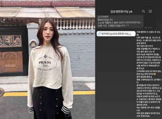 24일 박하선은 자신의 인스타그램에 "이제 웬만한 건 신경도 안 쓰는데 너무 심한 악플, 글, 인스타, 유튜브는 고소를 하면 보통 1년이 넘게 걸린다. '찾기 쉽지 않다'던가 선결제를 하고 적당히 소식도 없이 끝나는데 변호사님은 처음부터 3년을"이라고 시작하는 글과 함께 사진을 공개했다.