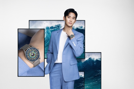화보 속 김수현은 바다를 연상시키는 하늘색 수트, 그리고 깔끔한 아이보리 니트와 베이지색 팬츠를 더한 포멀룩에 미도의 메인 컬렉션을 함께 매치해 한층 더 세련된 매력을 발산했다.