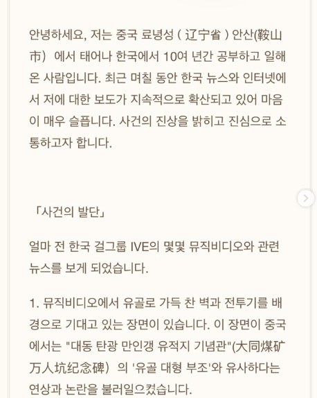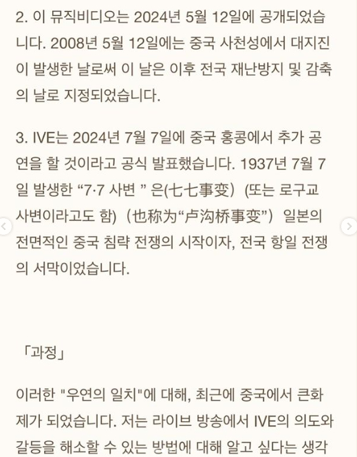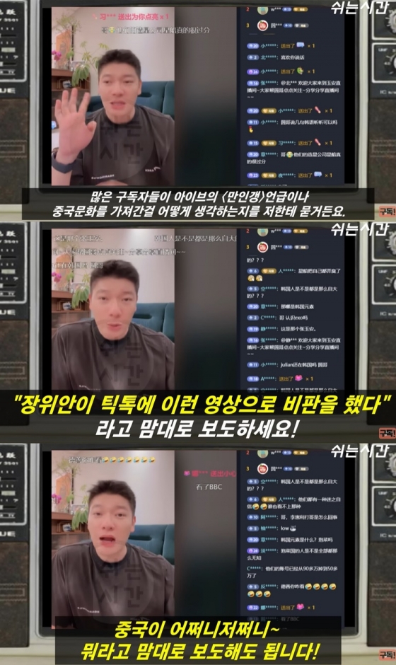 특히 장위안은 걸그룹 아이브 신곡 티저를 언급하며 "만인갱(일제의 집단 학살지)을 떠올리게 한다"라며 "티저 공개일과 콘서트 날짜가 중국의 아픈 역사와 관련 있다. 실수라면 해명하라"라며 "한국에 아무나 붙잡고 확인해서 3, 4대를 올라가면 그 조상 상당수가 중국인"이라고 주장하기도 했다.