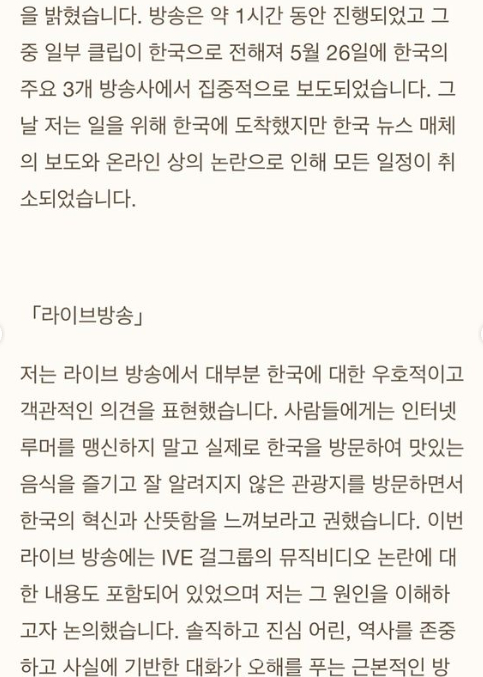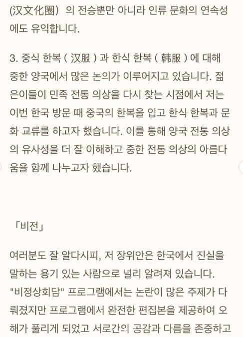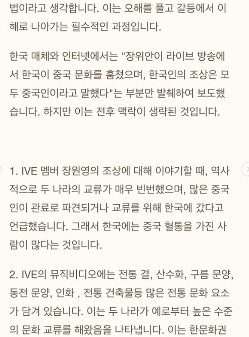이어 "장원영 조상에 대해 이야기할 때 역사적으로 두 나라 교류가 빈번했고 많은 중국인이 관료로, 교류를 위해 한국에 가서 한국에 중국 혈통의 사람이 많다는 것이다. 아이브 뮤직비디오에 많은 전통 문화 요소가 담겨 있는 것도 두 나라가 예로부터 높은 수준의 문화 교류를 했음을 나타낸다"라며 "중식 한복과 한식 한복도 많은 논의가 이뤄지고 있다. 나도 이번 한국 방문 때 중국 한복을 입고 한식 한복과 문화 교류를 하자고 했다'"라고 말했다.