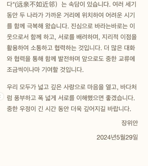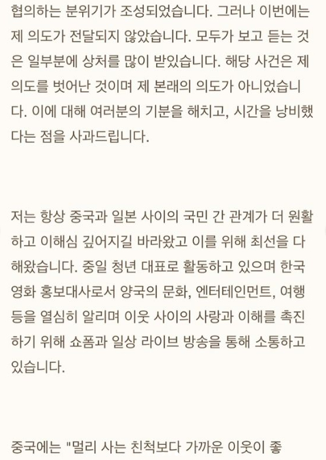 이후 장위안은 "방금 한국에 도착해서 일을 하려했다. 그런데 우리 팀원에게서 소식을 전해들었는데... 한국 실검에 올랐다는 소식이었다.게다가 한국 3대(메이저)언론이 다 언급을 했다더라. 여러분들도 한번 알아보셔도 좋을듯하다"라며 자신의 최근 발언이 이슈가 되고 있음을 알렸다. 이어 "이 일이 있고나서 솔직히 너무 큰 충격을 받았다. 사실 그게(그 말들이) 내 본의는 아니었기 때문이다. 그리고 우리 팀원이 알려주길 수많은 (한국에서의 업무) 계획과 기회가 모두 취소됐다고 들었다"라며 "그래서 지금 말씀드리고 싶은 건 이 일을 잘 처리하고 싶다. 그러니 내게 시간을 좀 달라. 내 진짜 속마음을 표하고 싶다"고 전했다. 장위안은 "동시에 내가 고수하는 한 가지 원칙은 '양국의 민간관계가 더욱 좋아지길 바란다'는 거다. 일할 기회는 언제든 다시 올 거다. 하지만 감정의 일은 전심으로 회복시켜야 하지 않을까"라고 덧붙였다.