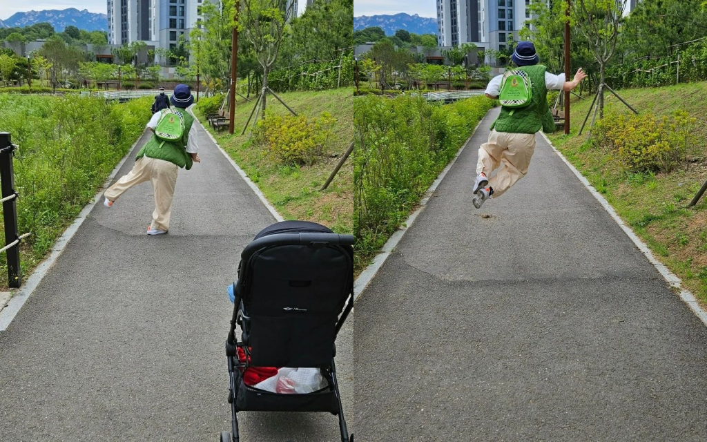 공개된 사진 속에는 아들의 어린이집 가방을 메고 폴짝 뛰는 안영미의 모습이 담겨있다. 안영미는 날씨가 좋은 것이라고 해명해 웃음을 안겼다.