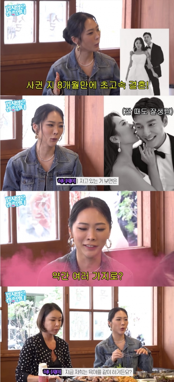 공개된 영상 속에는 댄서 배윤정, 허니제이가 게스트로 출연해 이지혜와 다양한 이야기를 나눴다. 먼저 허니제이는 남편과 만난 계기에 대해 "지인들이랑 함께하는 술자리에서 만났다. 근데 처음 만났을 때부터 계속 결혼 얘기를 하더라. 두 번째 만났을 때 '나 소름 돋아. 나 너랑 결혼할 것 같아'라고 하더라"라고 밝혔다.
