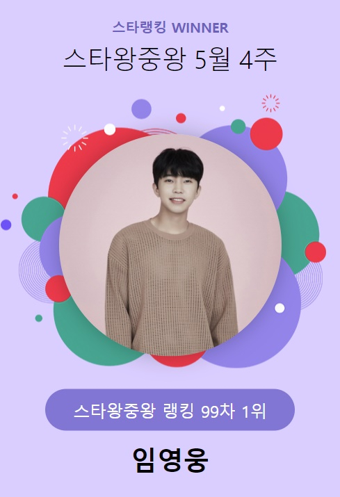 임영웅은 5월 24일 오후 3시 1분부터 31일 오후 3시까지 진행된 5월 4주차(99차) 스타왕중왕 랭킹 투표에서 18만 8016표를 받으며 정상을 지켰다.