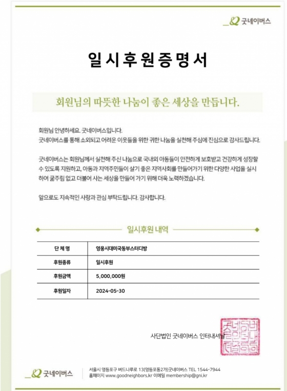 임영웅 팬클럽 영웅시대 미국동부스터디방 5월 30일 국제기아대책기구 굿네이버스에 500만 원을 기부했다.