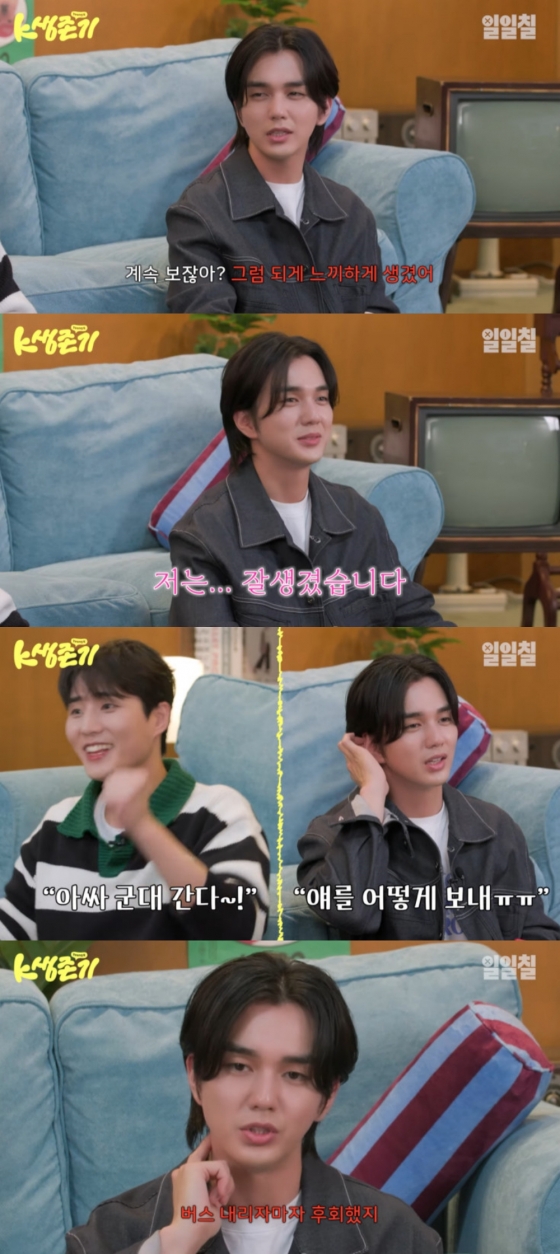 유승호는 군대에 일찍 간 데 대해 "'보고싶다' 촬영 중 입영통지서를 받았다. 얼른 가고 싶어서 기분이 좋았는데 스타일리스트 누나는 '얘를 어떻게 보내냐'라고 울더라. 드디어 군대 가서 너무 재밌을 것 같았는데 4일째 되던 날 후회됐다. 그냥 서 있는데 화가 나고 집에 가고 싶었다"며 조교 출신인 유승호는 "고참들이나 교관님들 보면서 말투를 연습했다. 제일 많이 했던 말은 '엎드려', '나가' 등이었다"고 말했다.