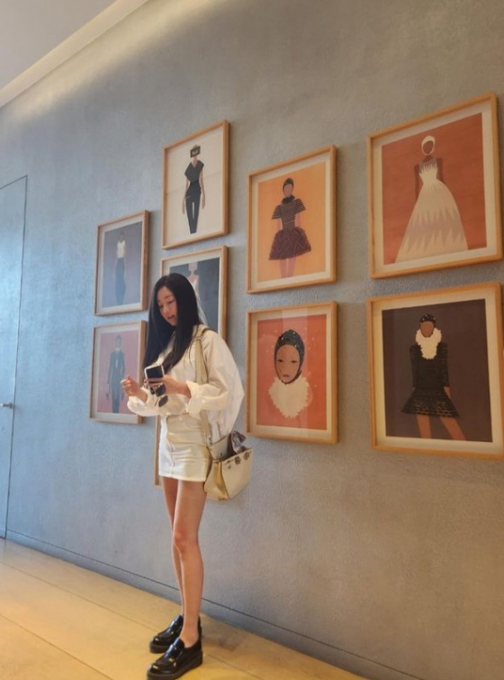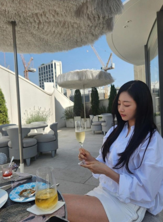 공개된 사진 속 김사랑은 흰색 셔츠와 흰색 미니스커트를 입고 야외 카페 자리에 앉아있다. 특히 그는 짧은 스커트 길이를 자랑하며 완벽한 몸매를 보였다.