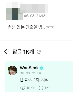 또 다른 팬이 "왜 오늘 선업튀 없어? 제발"이라고 글 쓰자 변우석은 "내 말이..."라며 같이 섭섭해하는 반응을 보였다.