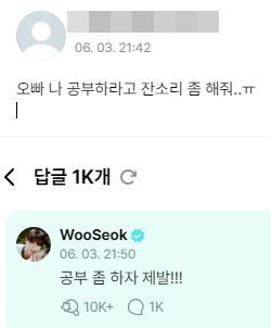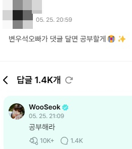 반면 변우석은 자기관리를 원하는 팬들에게는 단호한 답변을 줘 든든한 오빠미도 보였다. 한 팬이 "10시에 자라고 인사해주러 와라"라고 하자 변우석은 "아홉시에 옴"이라고 하는가 하면, 또 다른 이들이 "변우석 오빠가 댓글 달면 공부할게", "오빠 나 공부하라고 잔소리 좀 해줘"라고 하자 변우석은 "공부해라", "공부 좀 하자 제발!!!"이라고 댓글을 달아 웃음을 자아냈다.