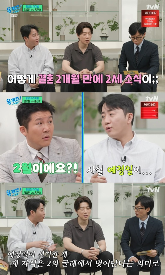 이날 홍진호는 결혼에 이어 2세 소식까지 겹경사를 축하받았다. 그는 "생각보다 빨리 왔다"고 기뻐했다.