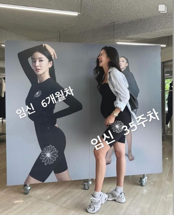 그는 자신의 광고 화보 사진 앞에서 화보 속 포즈를 취하다 웃음을 터트렸다. 만삭인 그는 볼록한 D라인을 제외하고 여전히 쭉 뻗은 몸매를 자랑했다.