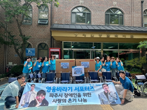임영웅 팬클럽 '영웅바라기 서포터즈'는 임영웅의 생일(6월 16일)을 기념, 지난 7일 파주시장애인복지관을 방문해 616만 원 상당 수동휠체어 11대를 기증했다.