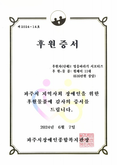 이번 후원은 '영웅바라기 서포터즈'의 열두 번째 후원 활동이다. '영웅바라기 서포터즈'는 지난 2021년부터 지속해서 파주시장애인종합복지관을 통해 장애인의 삶의 질 향상을 위한 후원 활동을 이어오고 있다. 장애인뿐 아니라 비장애인 대상 휠체어 대여사업에 동참함으로써 나눔을 통한 선한 영향력을 사회에 널리 전파하고 있다.