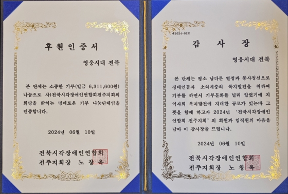 임영웅 팬클럽 '영웅시대 전북방'은 임영웅의 생일(6월 16일)을 맞아 10일 전북시각장애인연합회 전주지회(지회장 노창옥)에 631만 원을 기부했다.