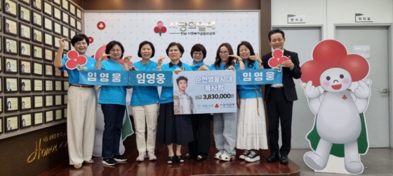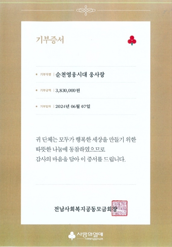 김동극 사랑의열매 전남사회복지공동모금회 사무처장은 "전남 도내에 선한 영향력을 전파하는 '순천영웅시대 웅사랑' 팬클럽에 진심으로 감사드린다"며 "전남 사랑의열매도 '영웅시대'와 함께 더 밝고 희망찬 사회가 될 수 있도록 노력하겠다"고 전했다.