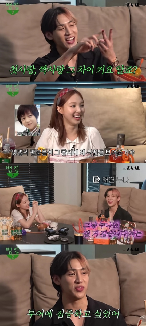 이날 나연은 "뱀뱀이 (짝사랑 사실을) 언급한 후 미안하다고 연락이 왔다"고 운을 뗐고, 뱀뱀은 "첫사랑 아니고 짝사랑이었다. 첫사랑과 짝사랑의 차이는 크다. 솔직히 그때 제가 엄청 어렸다. 누나를 짝사랑했다고 욕하는 분들이 좀 있다. 몇 팬분들이 당시에 제 사진을 보여준 거다. 욕하던 사람들도 그 사진을 보고 납득했다"고 말했다.