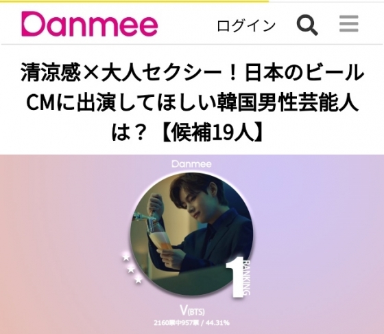 방탄소년단(BTS)의 뷔가 일본에서 진행된 '일본 맥주 광고에 나왔으면 하는 한국 남자 연예인' 투표에서 1위에 오르며 인기를 빛냈다.