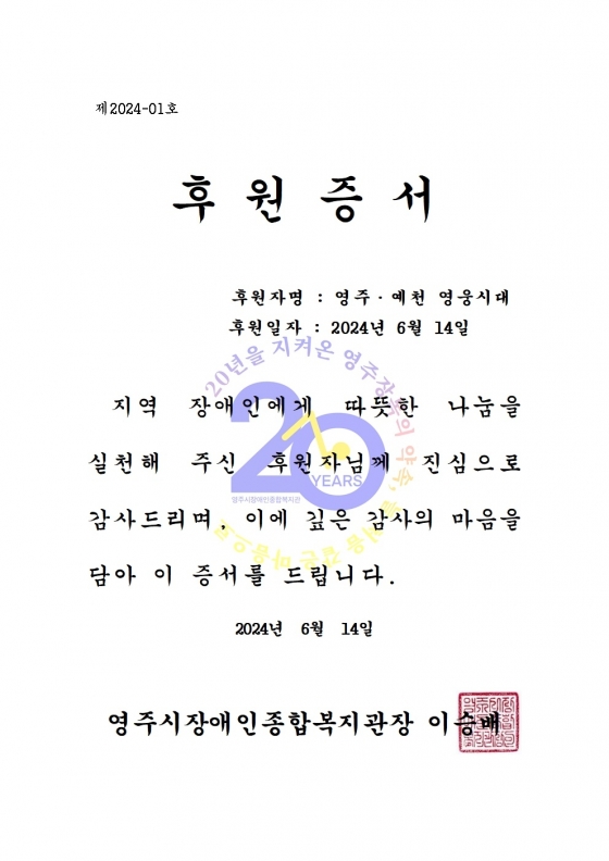 이승배 영주시장애인종합복지관장은 "지역사회에 관심을 갖고 나눔을 실천해주심에 진심으로 감사드린다"며 "이번 후원은 단순한 물품 전달을 넘어 팬클럽의 선한 영향력이 더욱 확산해 우리 사회가 나눔과 사랑의 온기로 가득했으면 좋겠다"고 전했다.