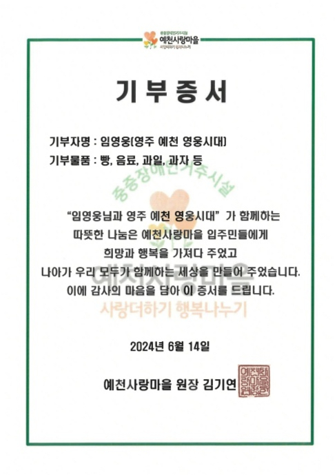 김기연 예천사랑마을 원장은 "임영웅과 '영주 예천 영웅시대'가 함께하는 따뜻한 마음은 예천사랑마을 입주민들에게 희망과 행복을 가져다 주었으며 나아가 우리 모두가 함께하는 세상을 만들어 주었다"고 감사를 전했다.