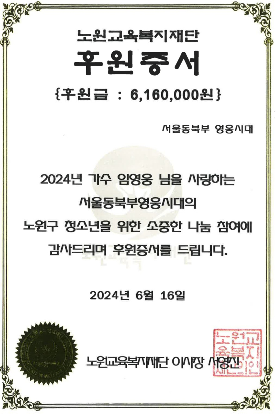 임영웅 팬클럽 '서울동북부 영웅시대'는 임영웅의 생일(6월 16일)을 맞아 지난 15일 노원교육복지재단(이사장 서영진)에 616만 원을 기부했다.