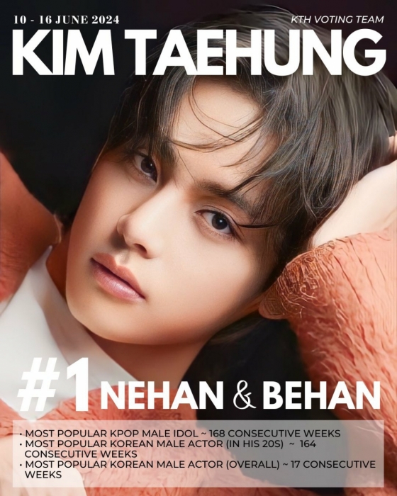뷔는 지난 6월 10일부터 6월 16일까지 일본 인기 아이돌 랭킹 사이트 '네한'(NEHAN)에서 실시한 K팝 남자 아이돌 랭킹 투표에서 1만 9726표를 얻어 1위를 차지, 168주 연속 1위의 대기록을 세웠다.