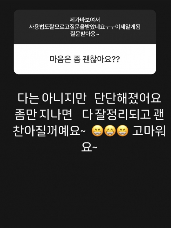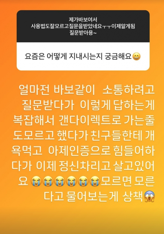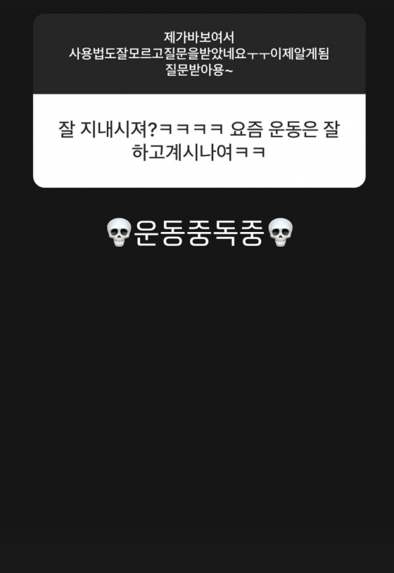 이어 근황을 묻는 질문에는 "운동중독증"이라며 "얼마전에 바보같이 소통하려고 질문받다가 이렇게 답하는 게 복잡해서 갠다이렉트로 가는 줄도 모르고 했다가 친구들에게 개욕먹고 아재인증으로 힘들어가다가 이제 정신차리고 살고 있어요. 모르면 모른다고 물어보는 게 상책"이라고 답했다.
