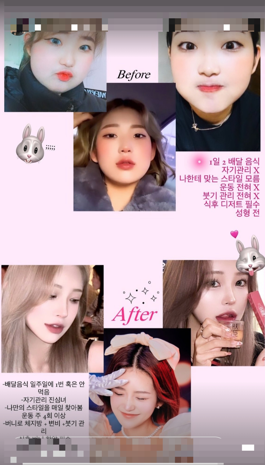 최준희는 자신의 과거 모습에 대해 "1일 2배달 음식, 자기관리X, 나한테 맞는 스타일 모름, 운동 전혀X, 부기 관리 전혀X, 식후 디저트 필수, 성형 전"이라고 떠올리고 달라진 자신의 모습에 대해서는 "배달 음식 일주일에 1번 혹은 안 먹음, 자기관리 진심녀, 운동 주4회 이상, 나만의 스타일을 매일 찾아봄, 윤곽 안함, 쌍수/코만 함"이라 적었다.