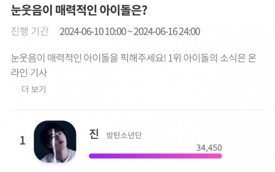 방탄소년단(BTS) 진이 '눈웃음이 매력적인 아이돌'로 1위로 오르며 화려한 귀환을 알렸다.