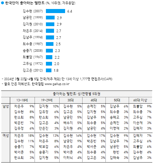 김수현은 한국갤럽이 2024년 3월 22일부터 4월 5일까지 전국(제주 제외) 만 13세 이상 1777명에게 가장 좋아하는 탤런트를 물은 결과(자유응답) 6.4%로 1위를 차지했다.