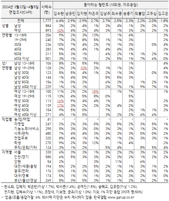 이외 1% 이상 응답된 탤런트는 한소희, 김혜자, 박은빈(이상 1.7%), 박서준(1.6%), 손예진(1.5%), 송혜교, 김유정'(이상 1.2%), 전지현, 김혜수(이상 1.1%), 조정석, 이보영, 공유(이상 1.0%) 등이다.
