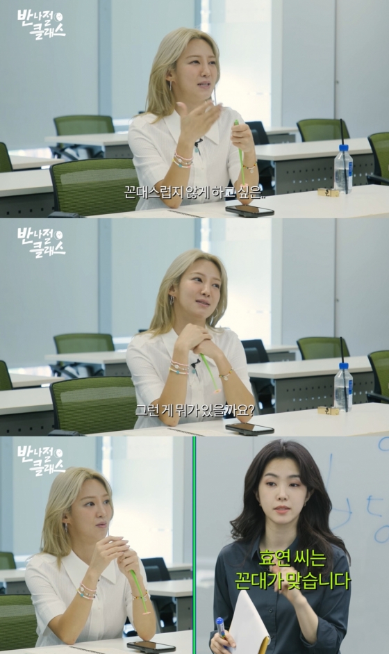 이날 효연은 자신의 고민으로 "후배들한테 밥 사주는 프로그램을 하고 있다. 이 안에서 그 친구들한테 조언을 해주고 싶긴 하다. 요즘 가장 신경 많이 쓰는 게 꼰대스럽지 않길 바란다"라며 "난 꼰대 같은 면이 있다. 이걸 듣는 친구는 꼰대라고 듣지 않아도 내가 그렇게 생각하는 거다"라고 털어놨다.