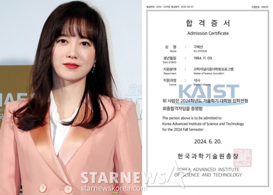 합격 증서에는 '위 사람은 2024학년도 가을학기 대학원 입학 전형 최종 합격자임을 증명함'라고 적혀 있다. 이에 따르면 구혜선은 카이스트 과학저널리즘대학원 프로그램에 지원해 이날 최종 합격 통보를 받았다.