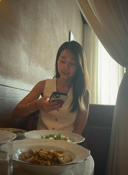사진에서 이진은 이 식당에서 식사 중인 듯하다. 이진은 민소매 상의를 입고 세월을 거스르는 미모를 과시하고 있다.