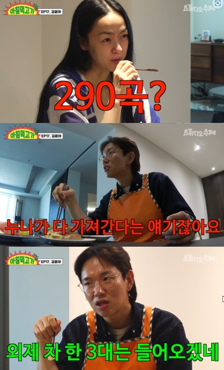 김윤아는 "얼마 전에 듣기로는 이승철 형님이 한 달에 외제 차 한 대 값 정도는 들어온다고 하던데 누나는 얼마 정도 들어오냐"는 장성규의 질문에 "공개하지 않을 것이다. 쉽게 안 넘어간다. 외제 차가 어떤 외제 차냐에 따라 달렸다"라고 말했다.