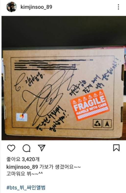 김진수는 최근 SNS에 "가보가 생겼어요~~고마워요 뷔~~^^"라는 글과 함께 뷔에게 받은 사인 앨범 선물을 인증했다.
