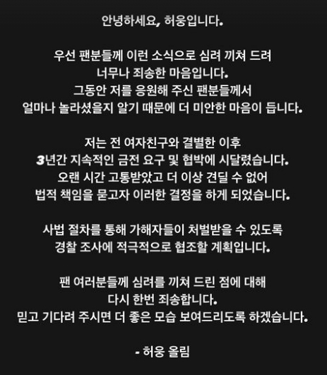 해당 소식이 공개되자 허웅은 같은 날 개인 SNS에 "우선 팬분들께 이런 소식으로 심려 끼쳐 드려 너무나 죄송한 마음"이라며 장문의 글을 게재했다. 그는 "그동안 나를 응원해 주신 팬분들께서 얼마나 놀라셨을지 알기 때문에 더 미안한 마음이 든다"면서 "나는 전 여자친구와 결별한 이후 3년간 지속적인 금전 요구 및 협박에 시달렸다. 오랜 시간 고통받았고 더 이상 견딜 수 없어 법적 책임을 묻고자 이러한 결정을 하게 됐다"라고 밝혔다.