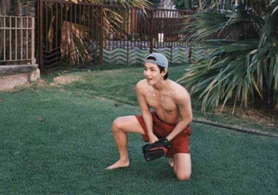 모자를 거꾸로 돌려쓰고 개구쟁이 같은 미소를 짓는 모습과 대비되는 탄탄한 근육의 몸매가 눈길을 사로잡는다. 상의를 탈의한 뷔는 넓은 어깨와 탄탄한 가슴 근육, 선명한 복근으로 건강한 남성미를 뽐내고 있다.