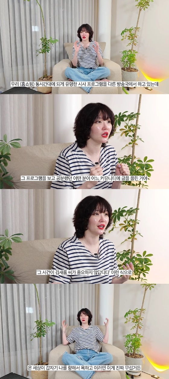 그러던 중 김새롬은 '정인이 사건' 실언 논란을 언급했다. 김새롬은 "우리 (홈쇼핑) 동시간대에 되게 유명한 시사 프로그램을 다른 방송국에서 하고 있었는데 그게 전 국민을 대상으로 공분을 사게 만든 주제였다. 그런데 나는 생방송을 하고 있으니까 동시간대에 어떤 주제가 나오는지 몰랐다. 홈쇼핑은 제일 중요한 게 시청률 잘 나오는 프로그램이 딱 끝나서 사람들이 채널을 돌리는 때가 진짜 중요한 시간이다"라며 "마침 PD가 '옆 방송 끝났습니다'라고 남겼길래 '끝났어요? 지금 그게 중요한 게 아니에요. 여러분 이걸 보세요'라고 상품 설명을 자연스럽게 한 건데 그 프로그램을 보고 공분했던 어떤 분이 커뮤니티에 '그 사건이 김새롬 씨가 중요하지 않답니다'라고 글을 올렸다"고 했다.