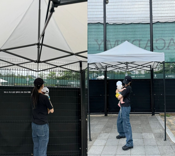 공개된 사진 속에는 아들을 품에 안고, 테니스 코트장을 엿보고 있는 손연재의 모습이 담겼다. 테니스를 치고 싶은 그의 욕구가 엿보인다. 손연재는 티셔츠에 청바지까지 편한 의상을 입고 아들을 소중하게 품에 안고 있다.