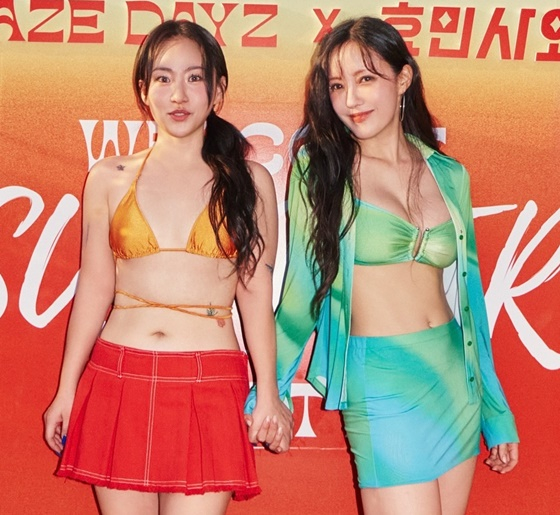 이와 함께 공개한 사진엔 행사장에서 절친 효민과 포즈를 취하는 조현아의 모습이 담겼다. 특히 두 사람은 '한뼘' 비키니를 입고 섹시미를 한껏 발산, 이목을 집중시켰다.